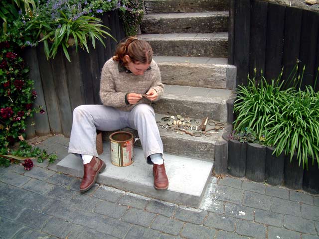 Lottie (my sis) sorts through a pile of horse brasses, nails, etc